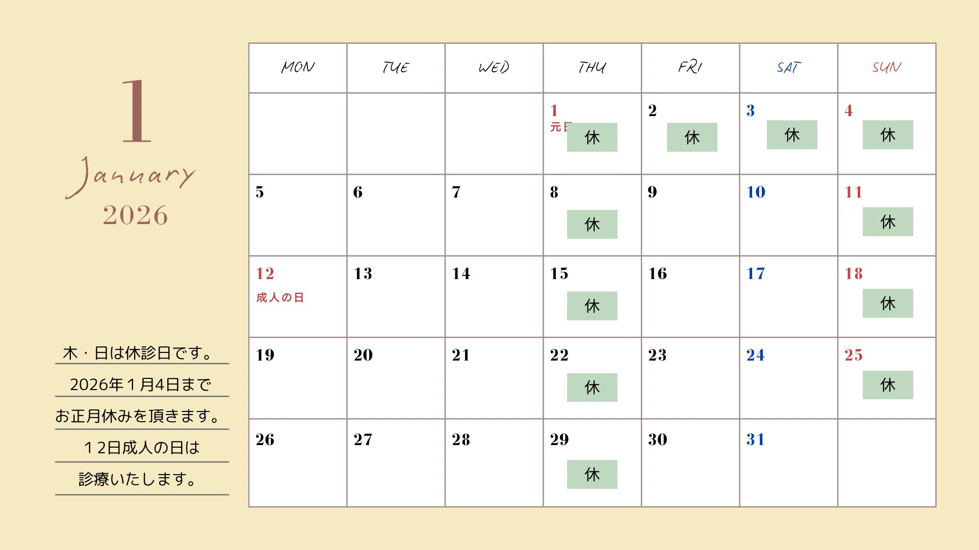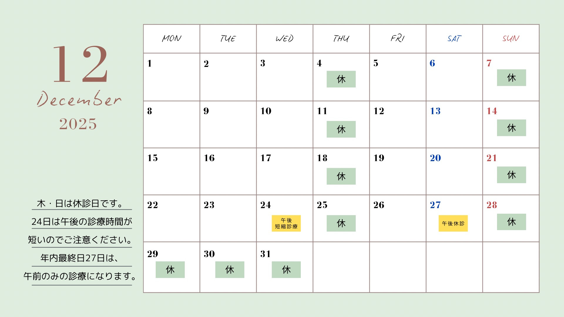 木・日休み。12月24日(水)は院長都合のため、診療時間が短いのでご注意ください。年末は12月27日(土)午前まで診療します。12日(月)成人の日は通常どおり診療いたします。